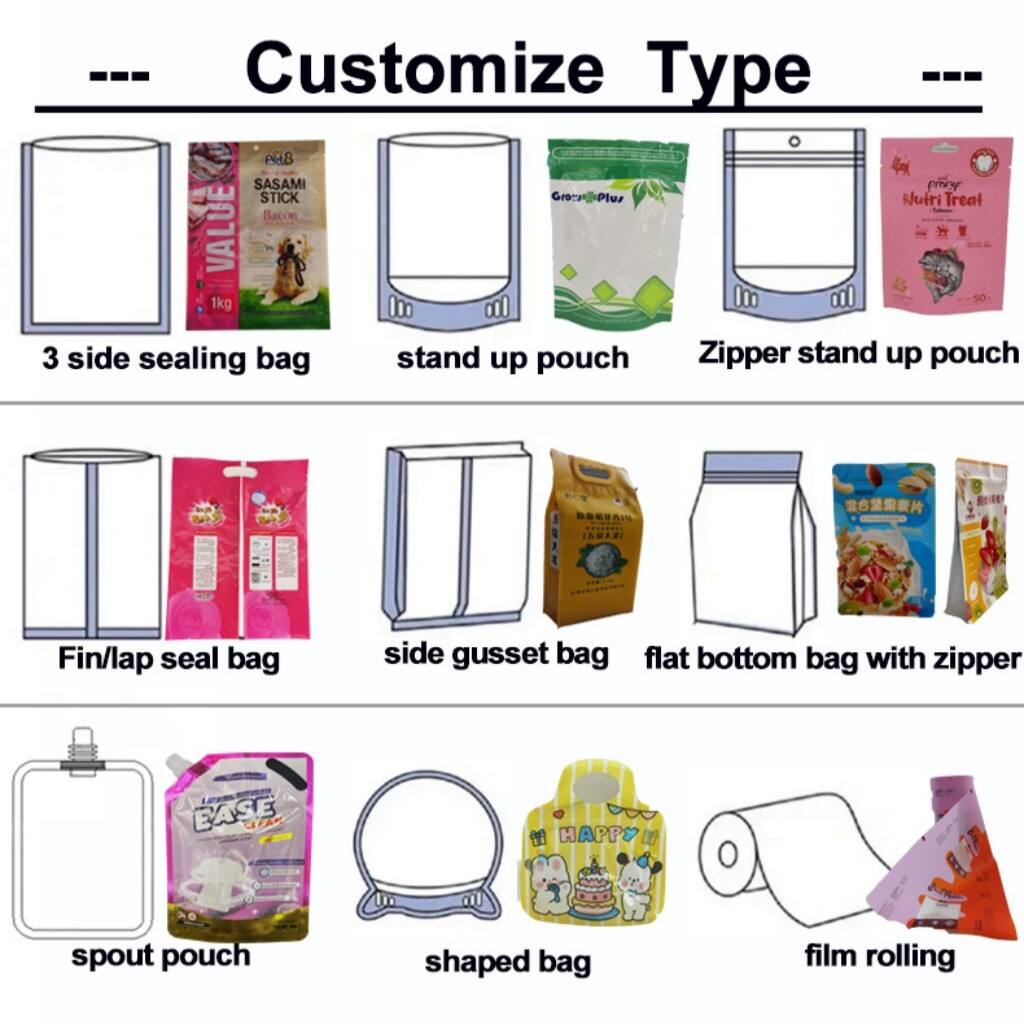 4) Stand up pouch,Stand up pouch with zip lock,Stand up pouch with spout,etc